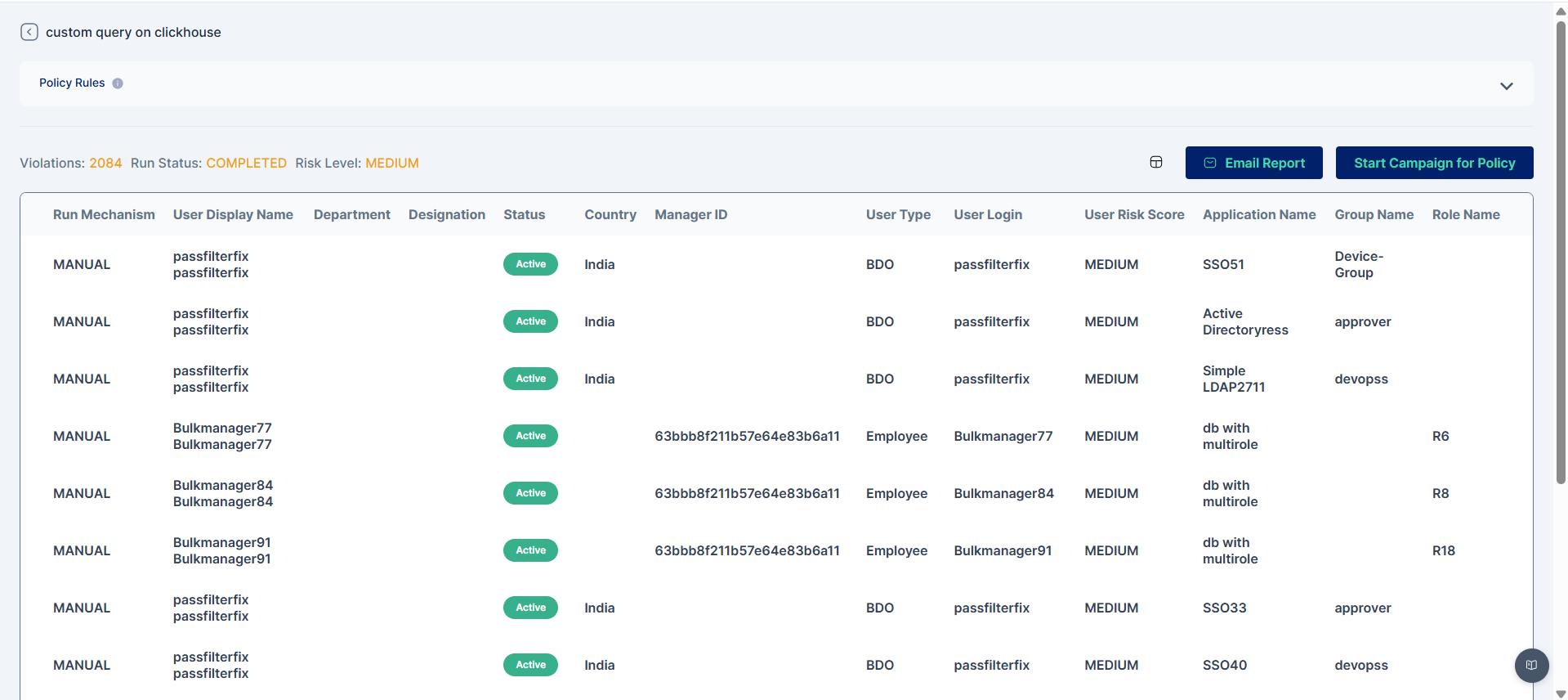 The administrators can schedule policy execution and automate report delivery, ensuring continuous monitoring and compliance. This feature streamlines the process of auditing user entitlements against predefined security policies.