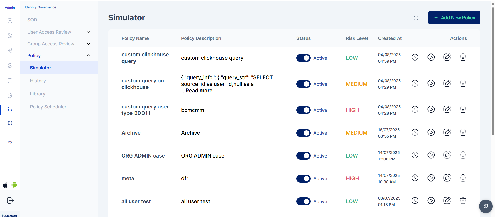 Administrators can use the Policy Simulator to create detailed policies based on various attributes of users, applications, and their entitlements. The feature supports the creation of highly customized rules using direct queries in databases like MongoDB and ClickHouse. The simulation process involves two primary components: