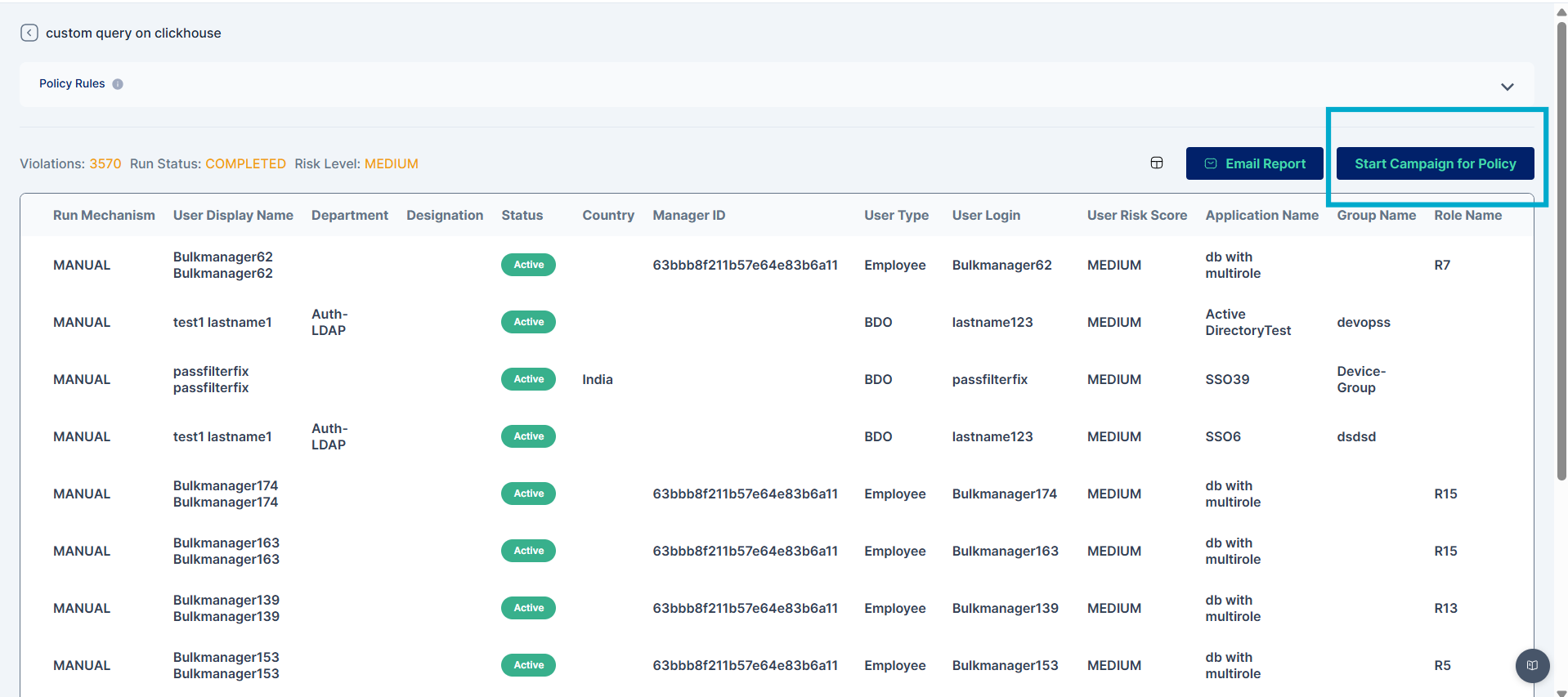 After an administrator has created and run a policy in the Policy Simulator, the system generates a detailed report of all identified violations. To initiate a remediation campaign based on these violations, the administrator can select the "Start Campaign for Policy" option. This feature automates the creation of a new access review campaign, pre-populating it with the specific users and entitlements that were flagged in the policy report. This streamlines the process, eliminating the need for manual data transfer and ensuring a direct and efficient path to remediation.