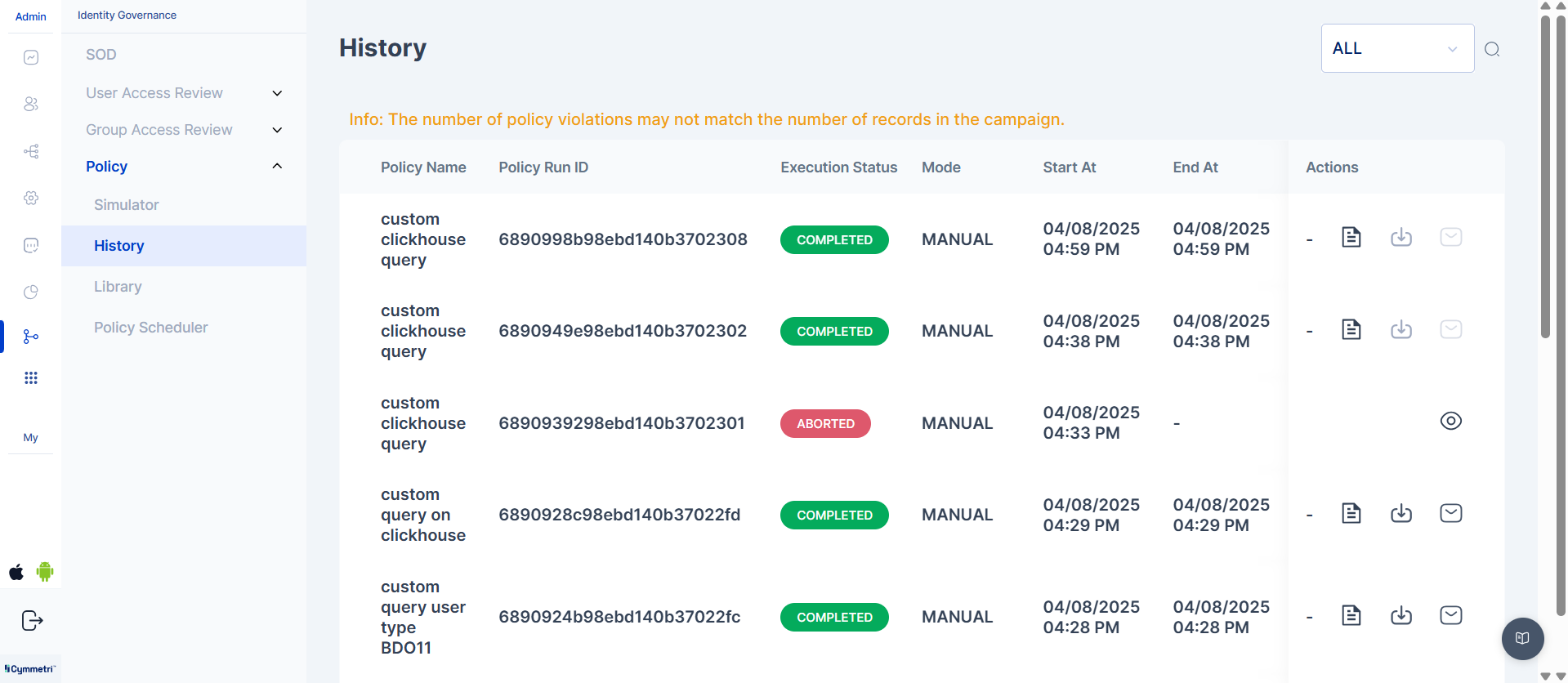 All previously created and run policies are accessible for review and historical analysis under the History tab, providing a complete audit trail of policy enforcement activities.
