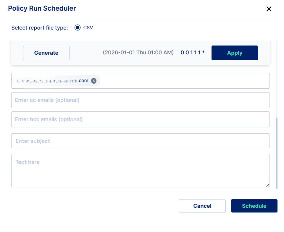 Upon execution, the system can automatically generate a report of all identified policy violations. This report is delivered to specified recipients in a CSV file format, which is ideal for data analysis and integration with other systems.