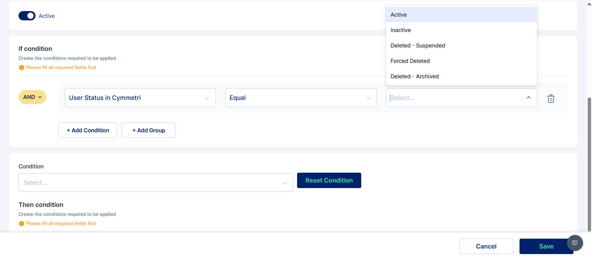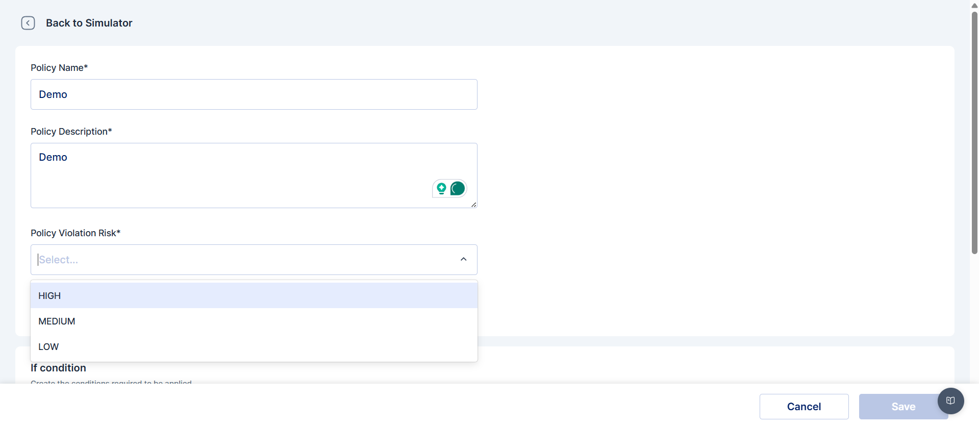 Establish Policy Rules (LHS-RHS): The Policy Simulator operates on an if-then or Left-Hand Side (LHS) - Right-Hand Side (RHS) rule-based logic. The administrator must define both conditions to create a complete policy: