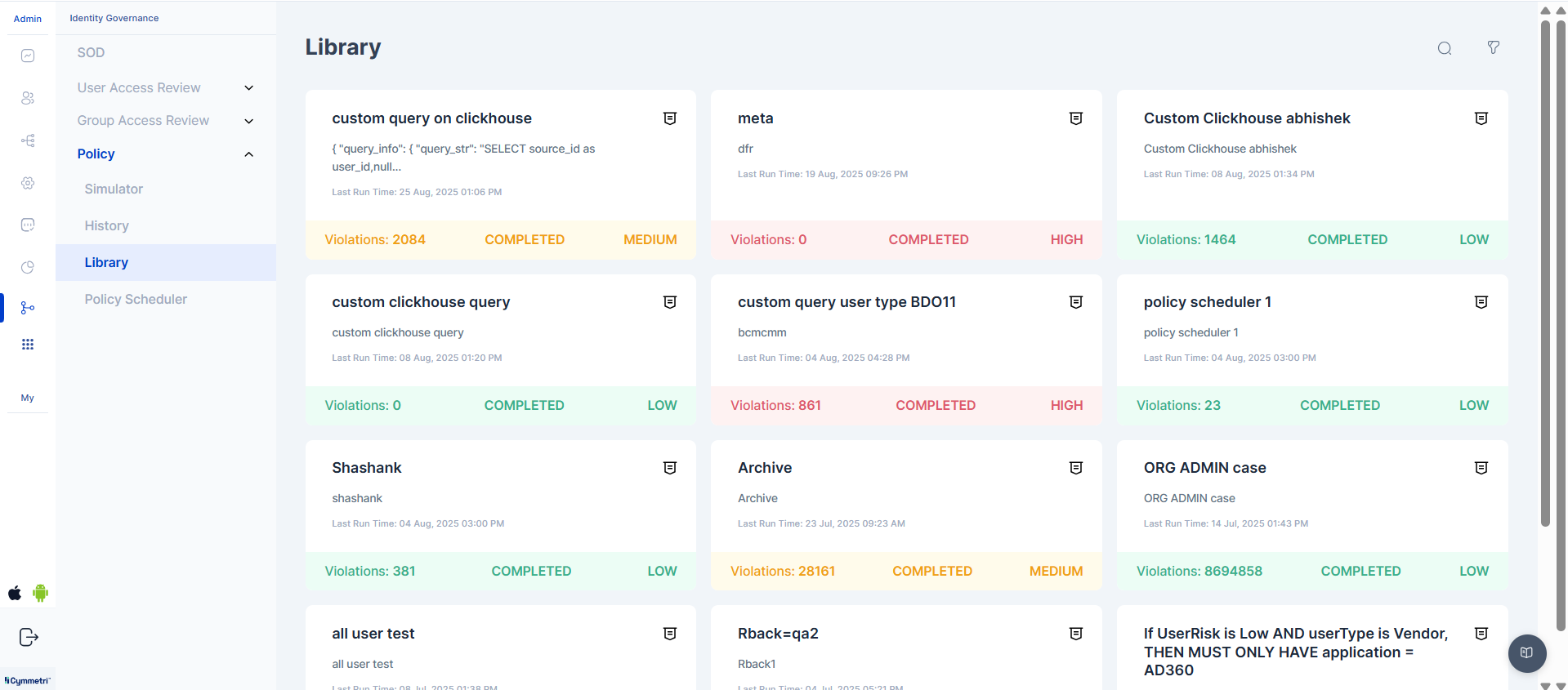 After a policy has been configured and published, the generated data is made available to the administrator in the Library section of the Identity Governance module.