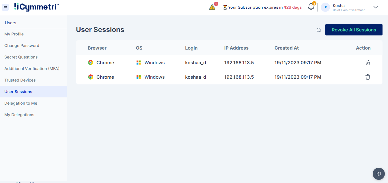Cymmetri allows users to have multiple sessions simulatenously i.e. they can login simulatenously from various locations and keep all the sessions alive. It also provides control to the user to revoke any specific or all the sessions