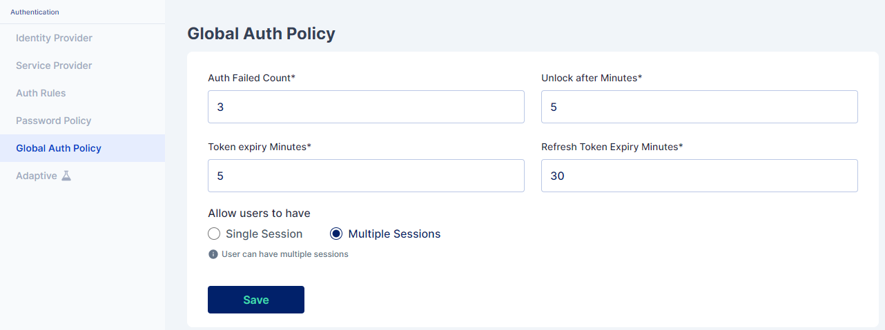 The Global Auth Policy allows to configure various user login parameters as shown below: