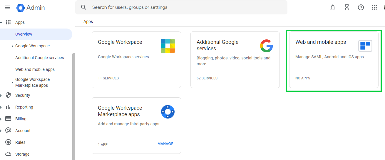 In the overview page click on the **Web and mobile apps** tile to add a new custom app