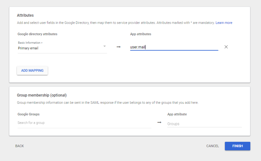 Group membership information can also be sent by configuring groups here and if the user belongs to the configured group. Once attributes and groups are configured click on **FINISH.**