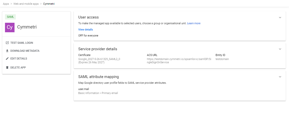 Once you click on the FINISH button the below screen appears that shows the configuration details. It also shows various shortcuts to **Test SAML Login, Download Metadata, Edit Details, and Delete the App**