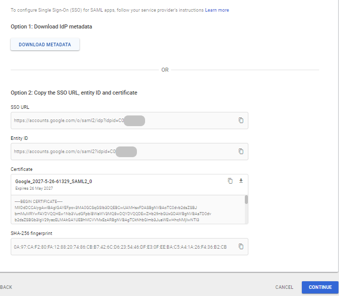 On the Google Identity Provider Detail page download the metadata file by clicking on the **DOWNLOAD METADATA** button. This metadata file needs to be used to get Entity ID, SSO URL, and Certificate. Administrators can download the certificate here or later as shown [here](#download-idp-certificate). Once downloaded click on **Continue**.