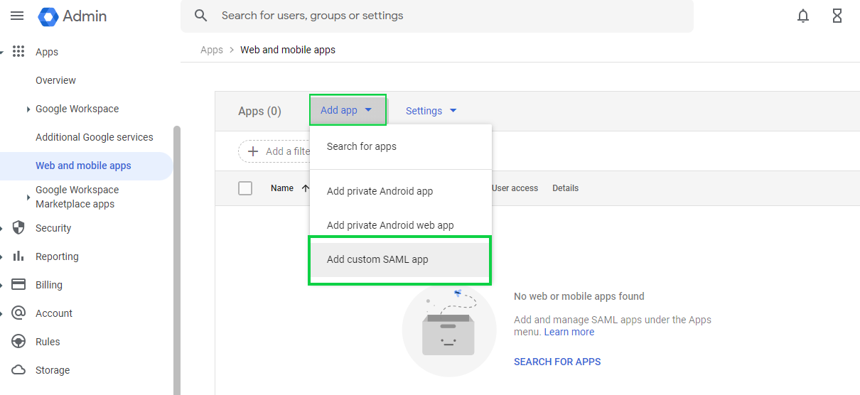 On the Web and mobile apps page click on the **Add app** dropdown and then select **Add custom SAML app** to add the Cymmetri tenant as a custom app