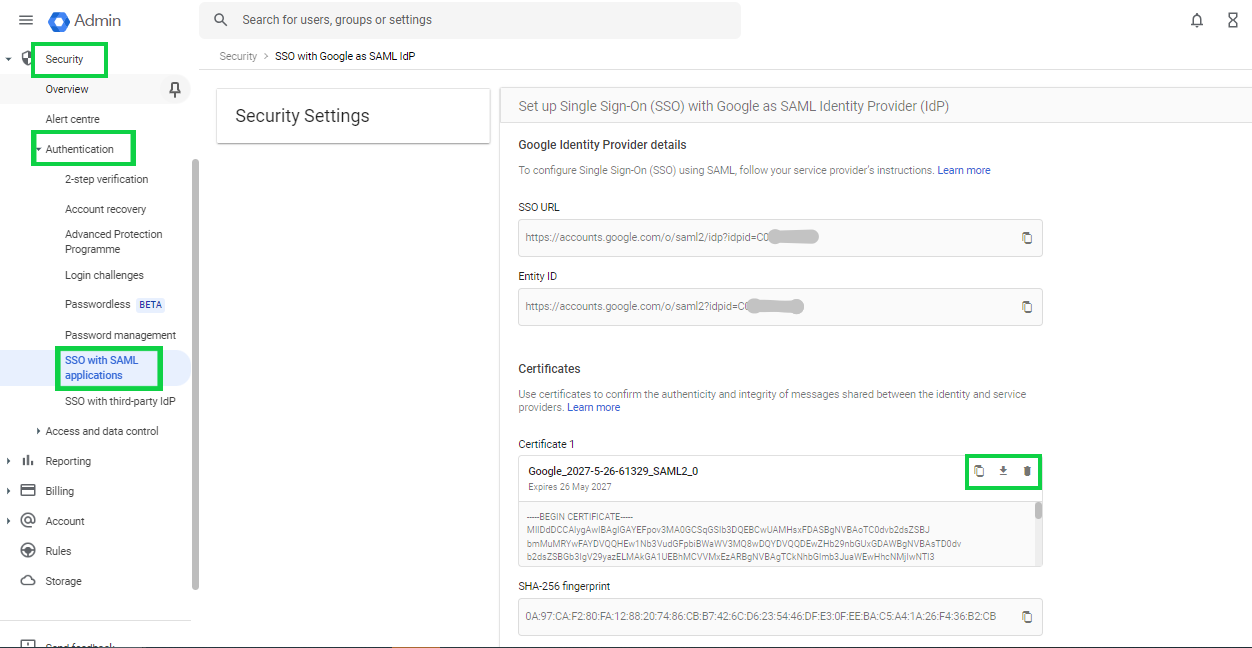 If the administrator does not download the certificate while configuring the custom application, it can be later downloaded. For the same the administrator needs to go to **Security>Authentication>SSO with SAML applications.** This will open the Security Settings page from where either the IDP details like SSO URL and Entity ID can be copied and the IDP Certificate can be downloaded. These details can be used to configure the IDP in Cymmetri.