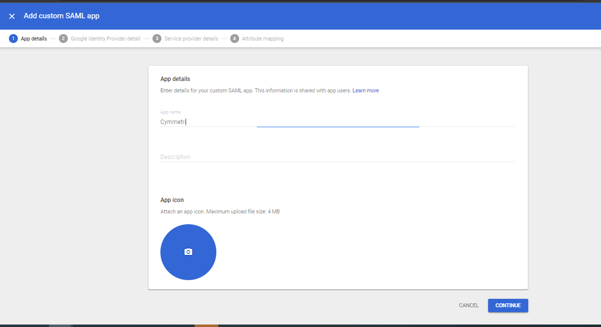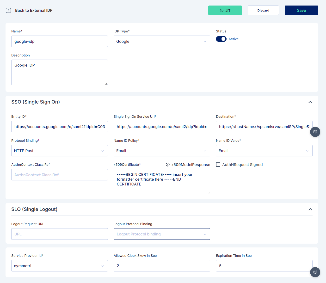Once Google IDP is configured, the administrator must proceed with the configuration on the Cymmetri side. To achieve this, the administrator needs to set up Cymmetri as a Service Provider and also incorporate Google as an external IDP.