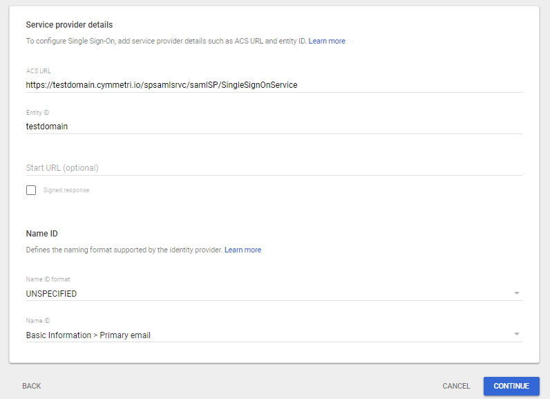 Once the IDP metadata and certificate are obtained the Service Provider(i.e. Cymmetri) details need to be provided. We need to provide the **ACS URL** and the **Entity ID** these details can be obtained from Cymmetri as shown here. No change needs to be done for the Name ID format and Name ID, it can be kept to **UNSPECIFIED** and **Basic Information > Primary email**. Once done click on **Continue**