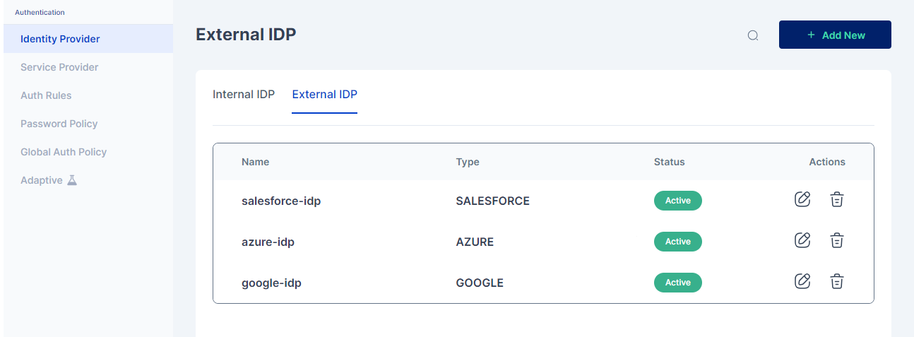 Administrator needs to go to **Authentication->Identity Provider->External IDP.** Here you may either configure the already created **google-idp** instance or **+Add New**