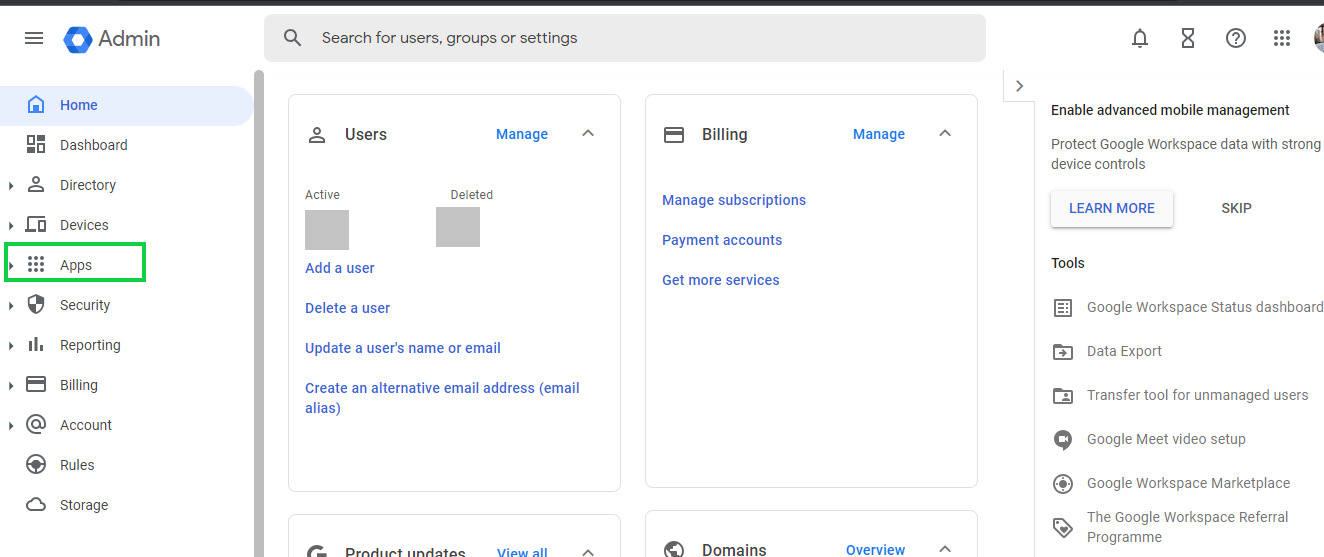 1. Log in to your Google admin account and go to the **Admin Section** as shown below: