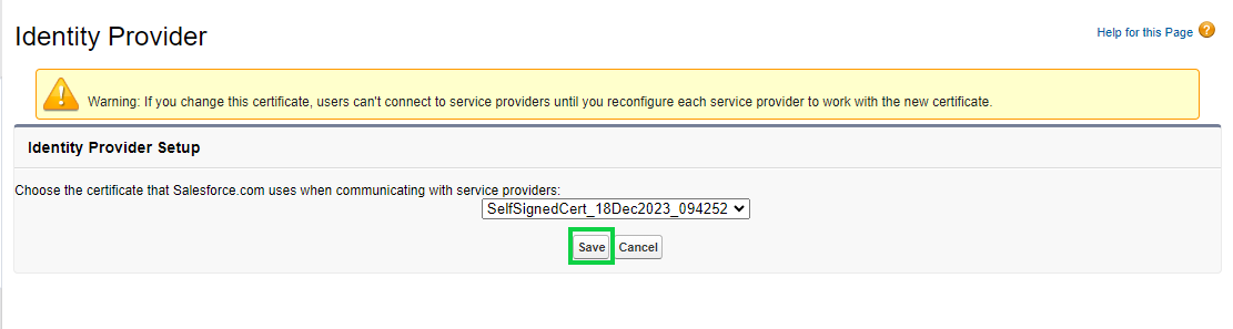 When the Enable Identity Provider button is clicked it opens a page that asks you to choose a certificate. Select the default certificate here and click **Save**.