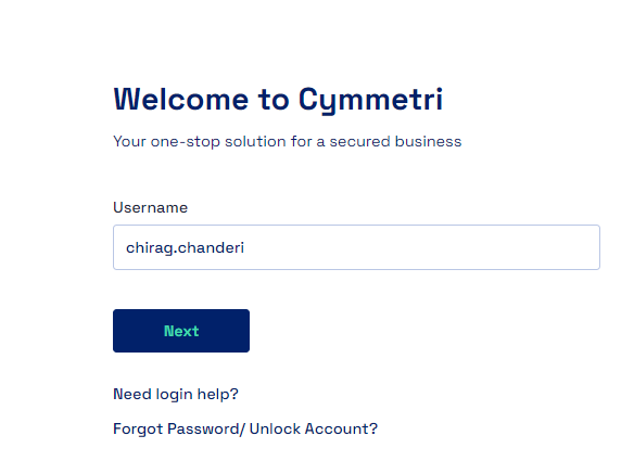 Now the user can login into Cymmetri using Salesforce. The user needs to provide his/her username and click on **Next.**