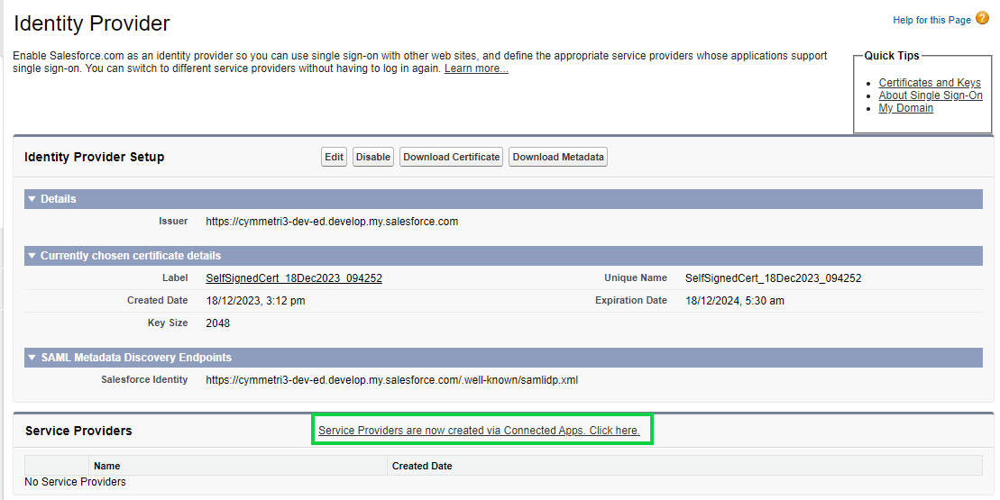 Once the files are downloaded next to add the Service Provider the salesforce administrator needs to click on **Service Providers are now created via Connected Apps. Click here** link. The mentioned link allows to create a Connected App for Cymmetri which acts as a service provider in Salesforce.