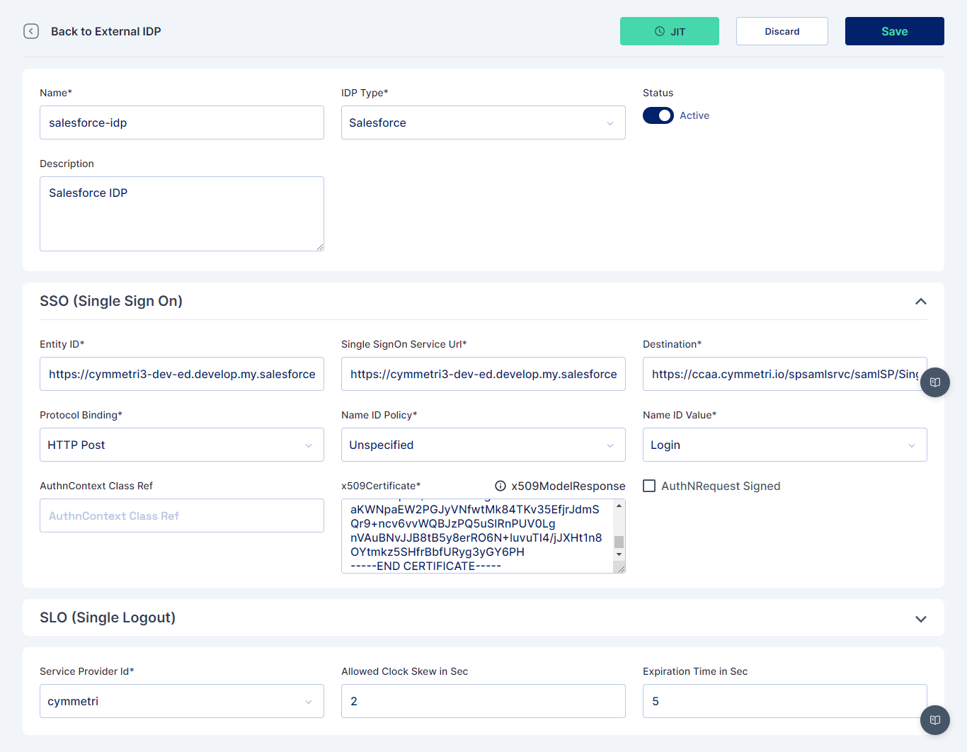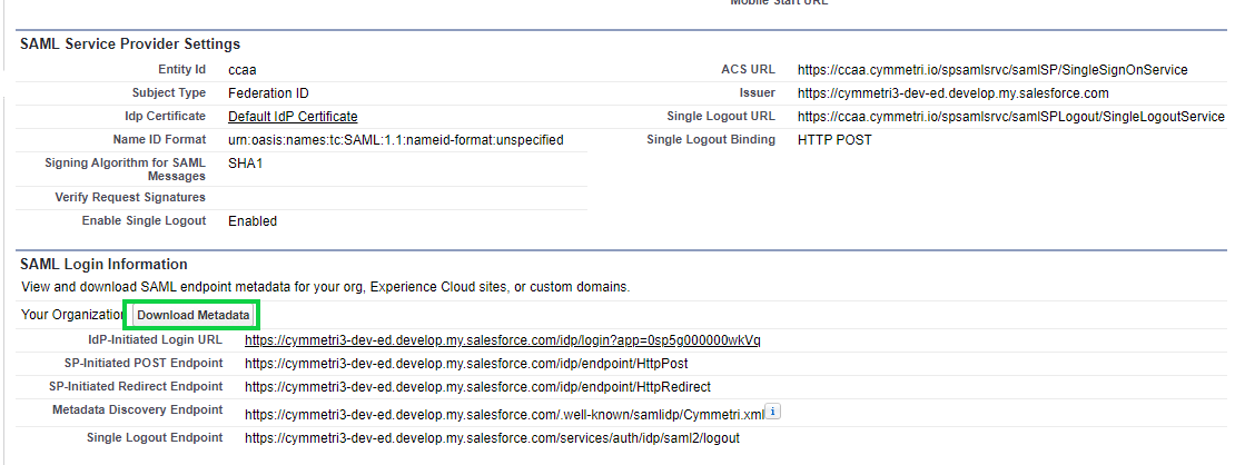 The above-mentioned details can be obtained by adding a service provider in Cymmetri as shown below. To know more about how to add a service provider in Cymmetri click [here](https://help.cymmetri.io/identity-hub/authentication/identity-provider/external-idp/broken-reference). Once created these details can be used in Salesforce as shown above.