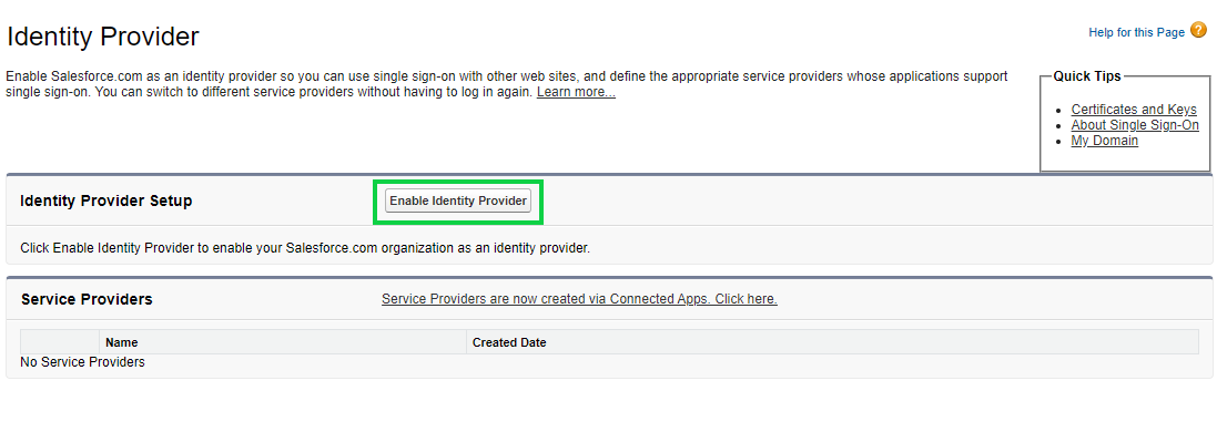 When the Identity Provider page opens click on the **Enable Identity Provider** button to enable Salesforce as an Identity Provider so that it can be used for authentication in Cymmetri.