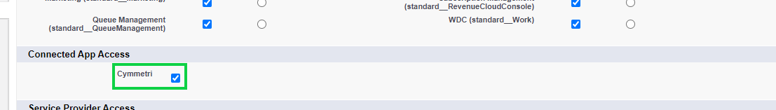 In the Connected App Access section look for the custom app you created(Cymmetri in this case) and click the checkbox to enable the access.