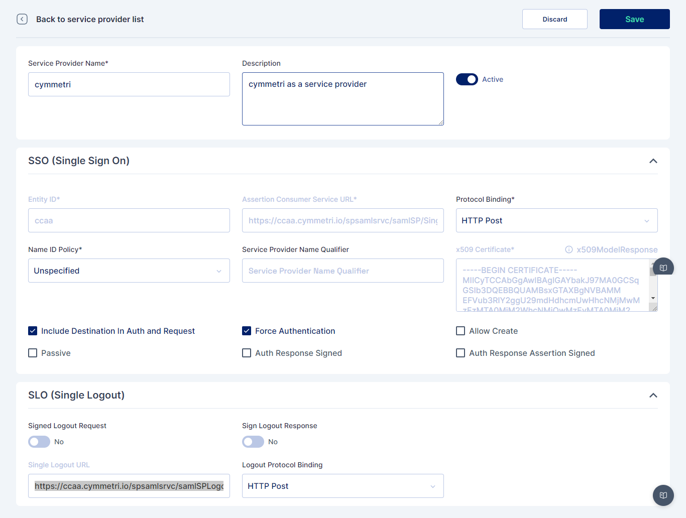 * **Service Provider Id:** cymmetri (Need to the select the configured Service Provider as shown above)