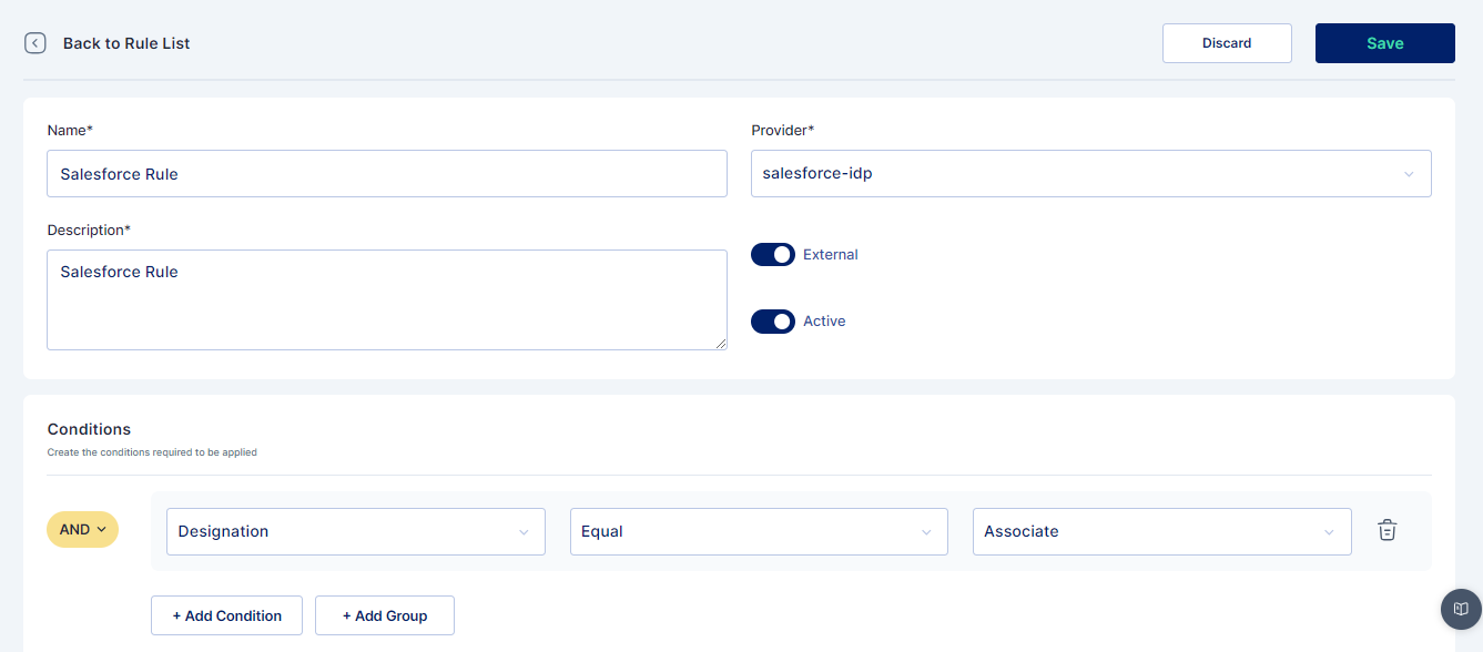 Once the external IDP is configured next we need to configure Authentication Rules as explained [here ](https://help.cymmetri.io/identity-hub/authentication/identity-provider/external-idp/broken-reference)and as shown below. Conditions mentioned here may vary based on actual scenario in which the IDP needs to be applicable.