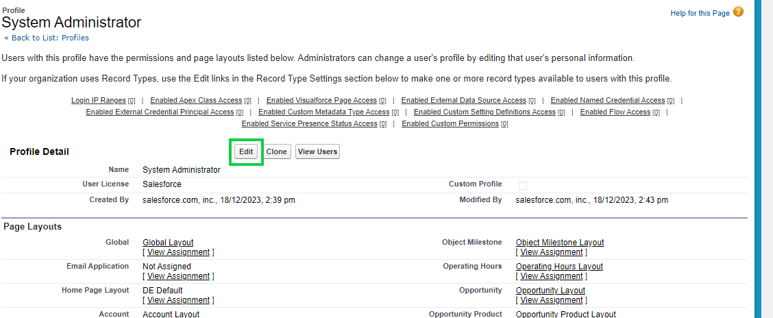 Once the profile is selected click on the **Edit** button and look for the **Connected App Access** section.