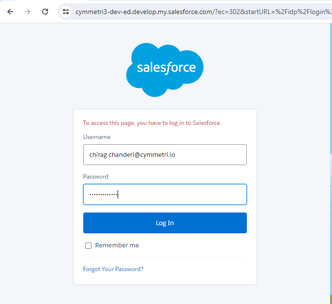 The user is then redirected to Salesforce login page where the user needs to enter their Salesforce credentials and click on **Log in**