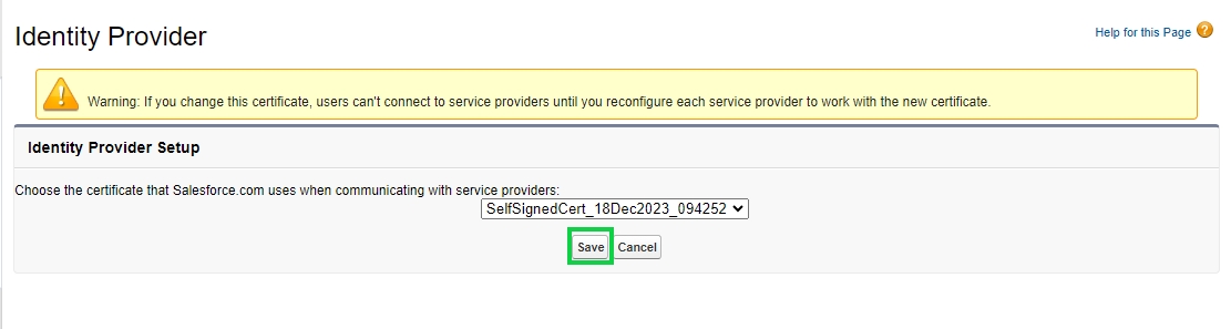 When the Enable Identity Provider button is clicked it opens a page that asks you to choose a certificate. Select the default certificate here and click Save.