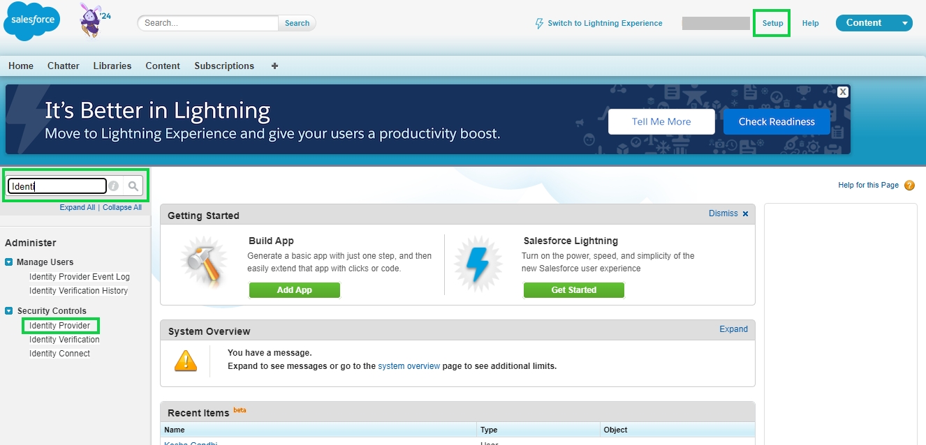 Once logged in the administrator needs to click on Setup on the top right and then in the search bar on the right side search for Identity Providers. Once found click on Security Controls -> Identity Provider menu