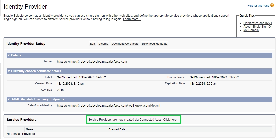 Once the files are downloaded next to add the Service Provider the salesforce administrator needs to click on Service Providers are now created via Connected Apps. Click here link. The mentioned link allows to create a Connected App for Cymmetri which acts as a service provider in Salesforce.