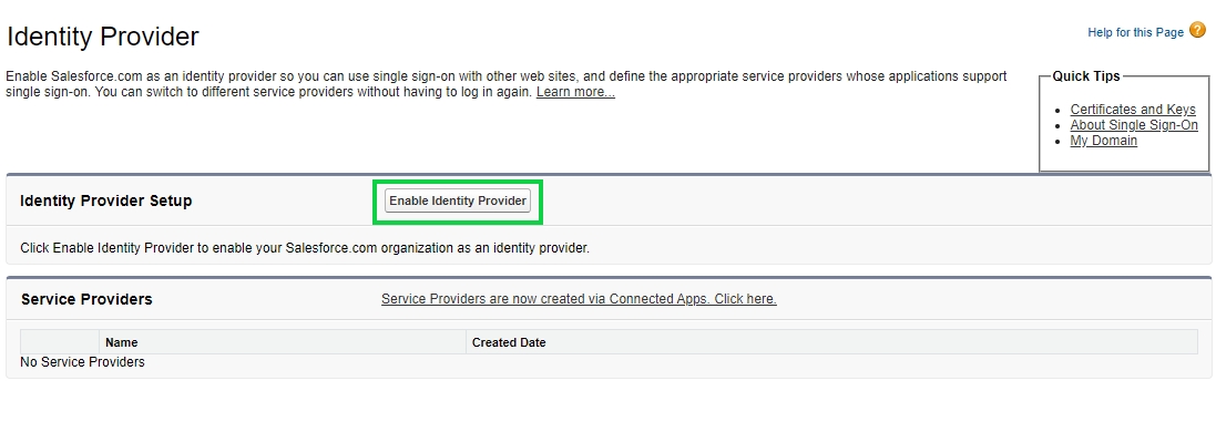 When the Identity Provider page opens click on the Enable Identity Provider button to enable Salesforce as an Identity Provider so that it can be used for authentication in Cymmetri.