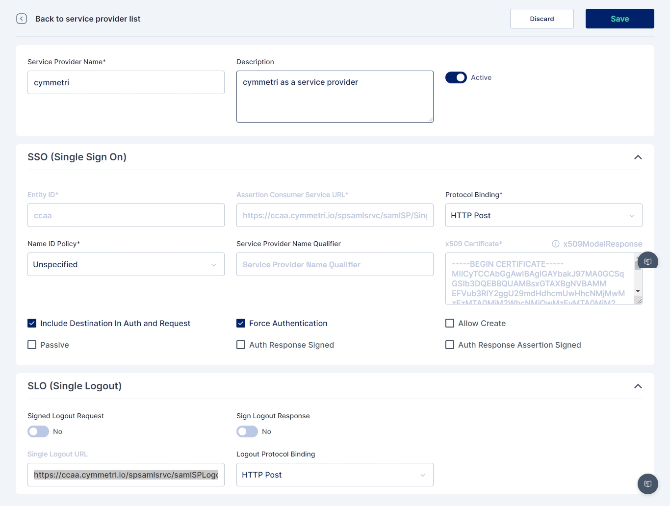 The above-mentioned details can be obtained by adding a service provider in Cymmetri as shown below. To know more about how to add a service provider in Cymmetri click here. Once created these details can be used in Salesforce as shown above.