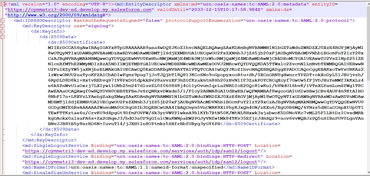 The metadata file appears as below, this data is used later to configure the External IDP in Cymmetri.