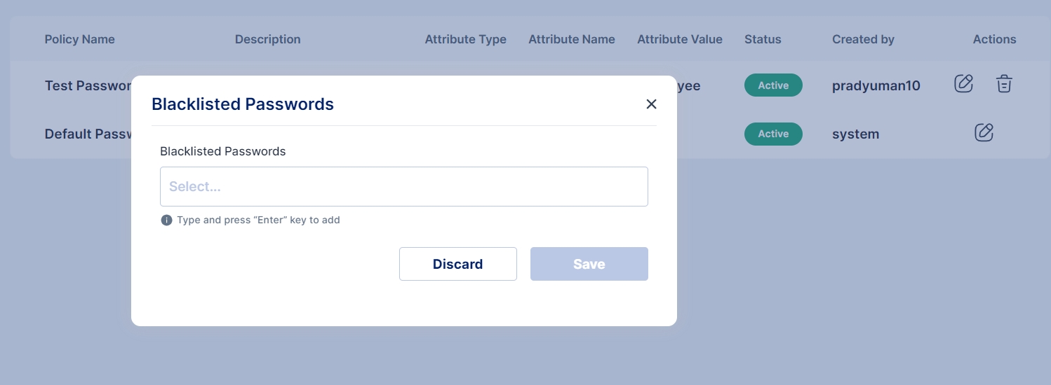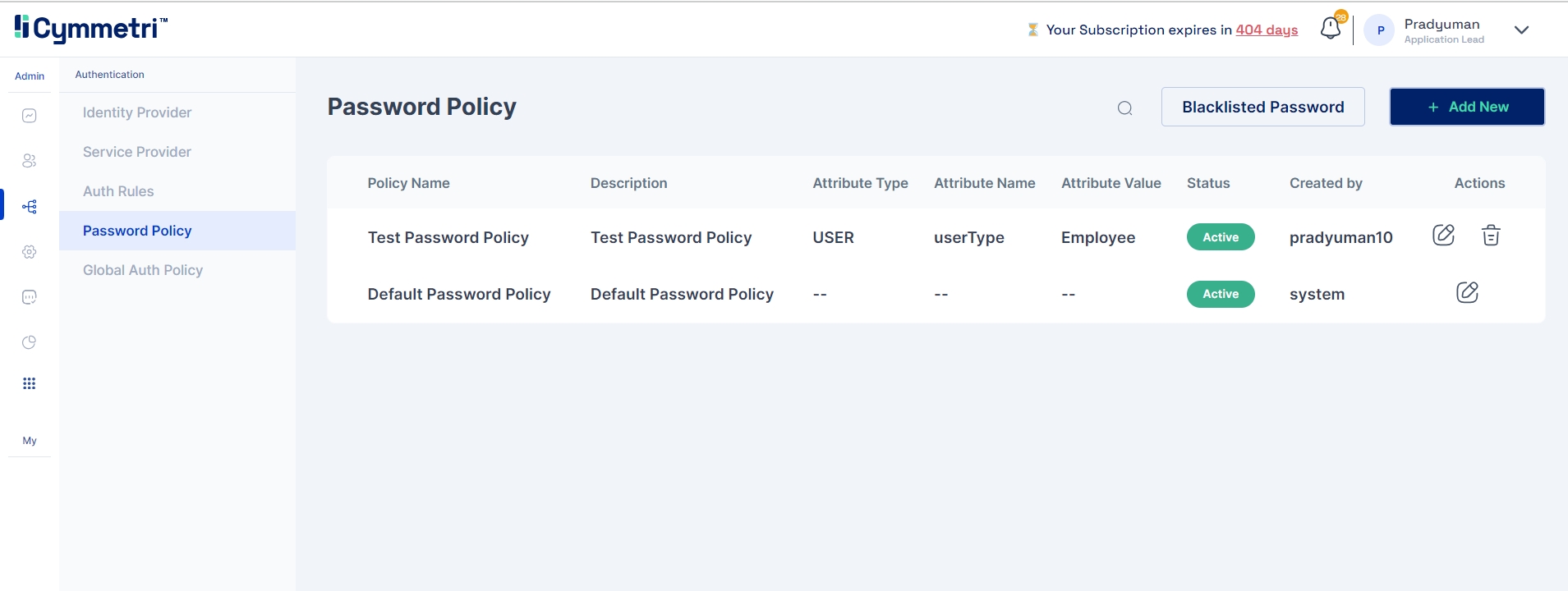 Upon landing the user can view a default Cymmetri password policy which cant be deleted or deactivated.