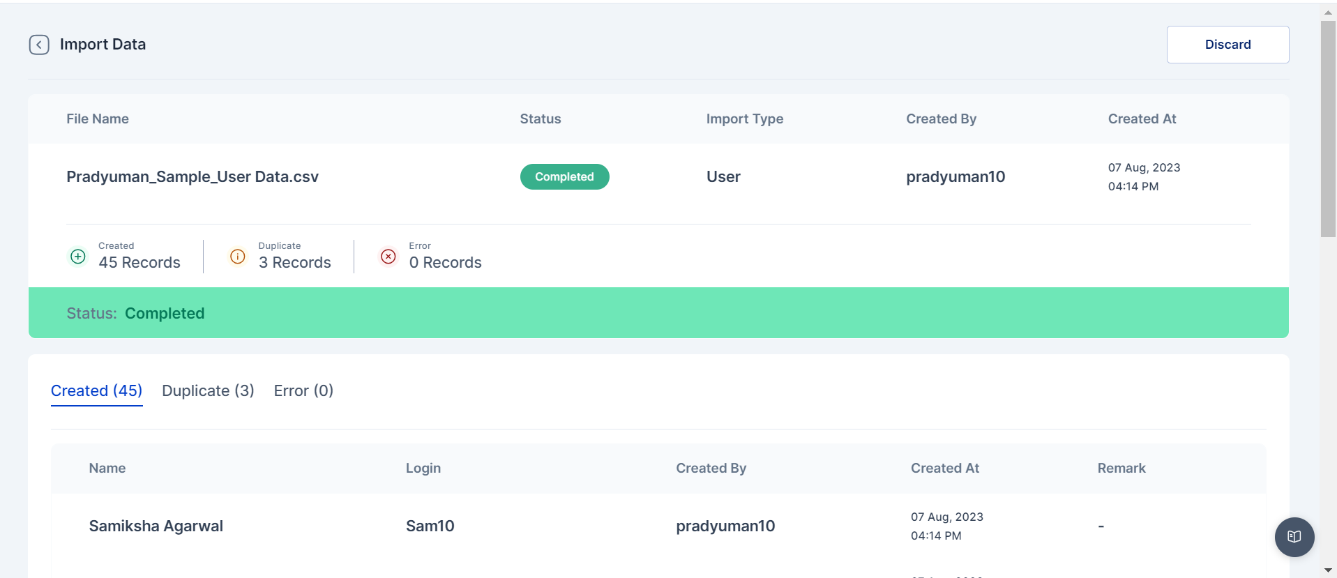 Created Successfully in Cymmetri: Indicates records that were successfully created within the Cymmetri system during the import.