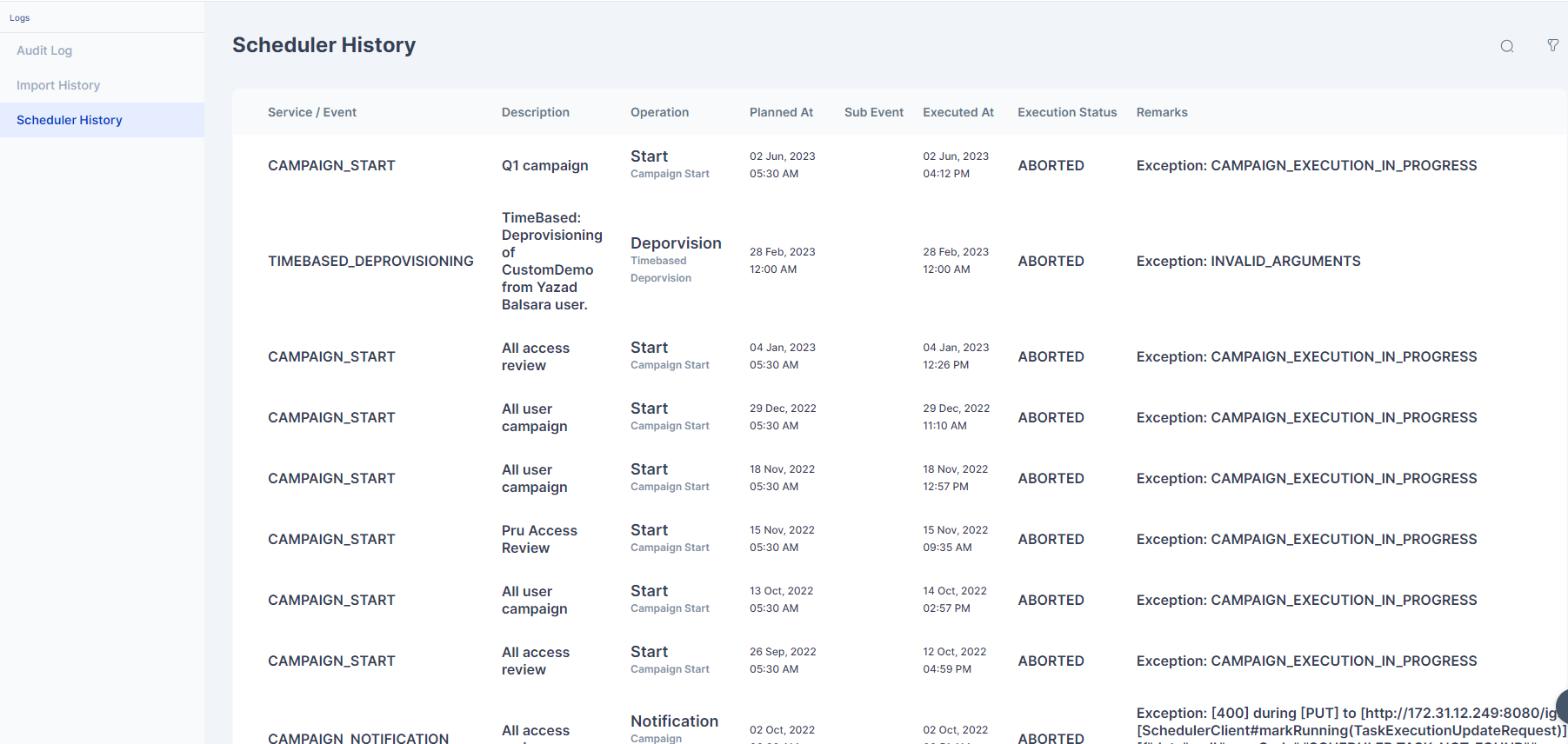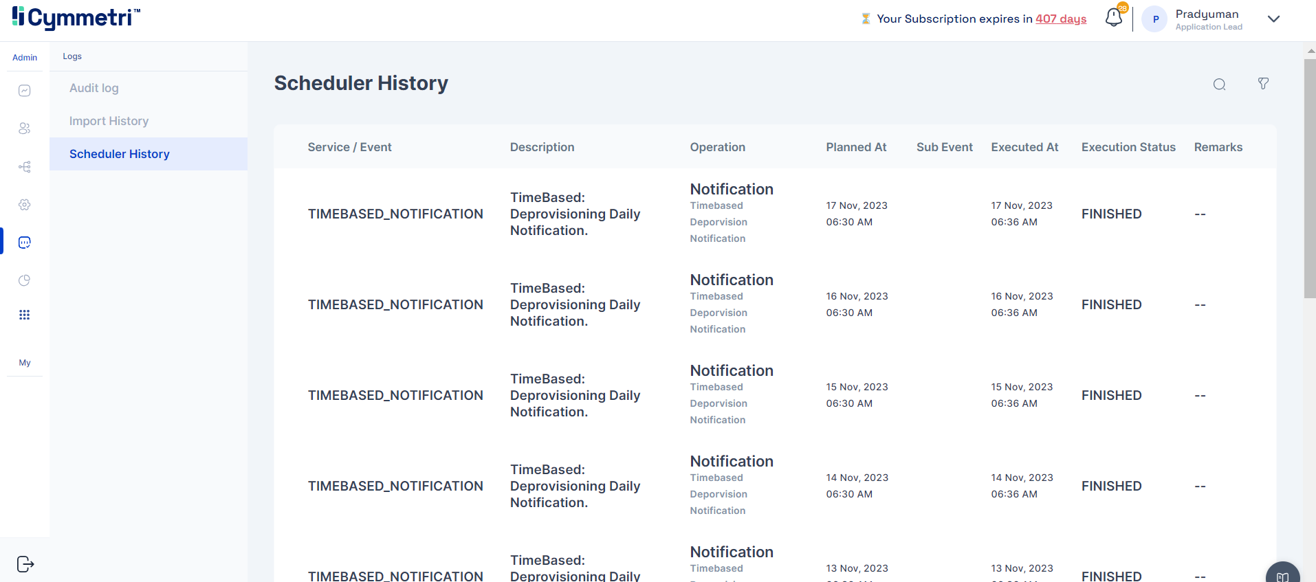 In the "Scheduler History" tab, accessible within the Logs section of Cymmetri, administrators can delve into the details of scheduled tasks, gaining insights into various aspects of the scheduler's operation. The information presented includes: