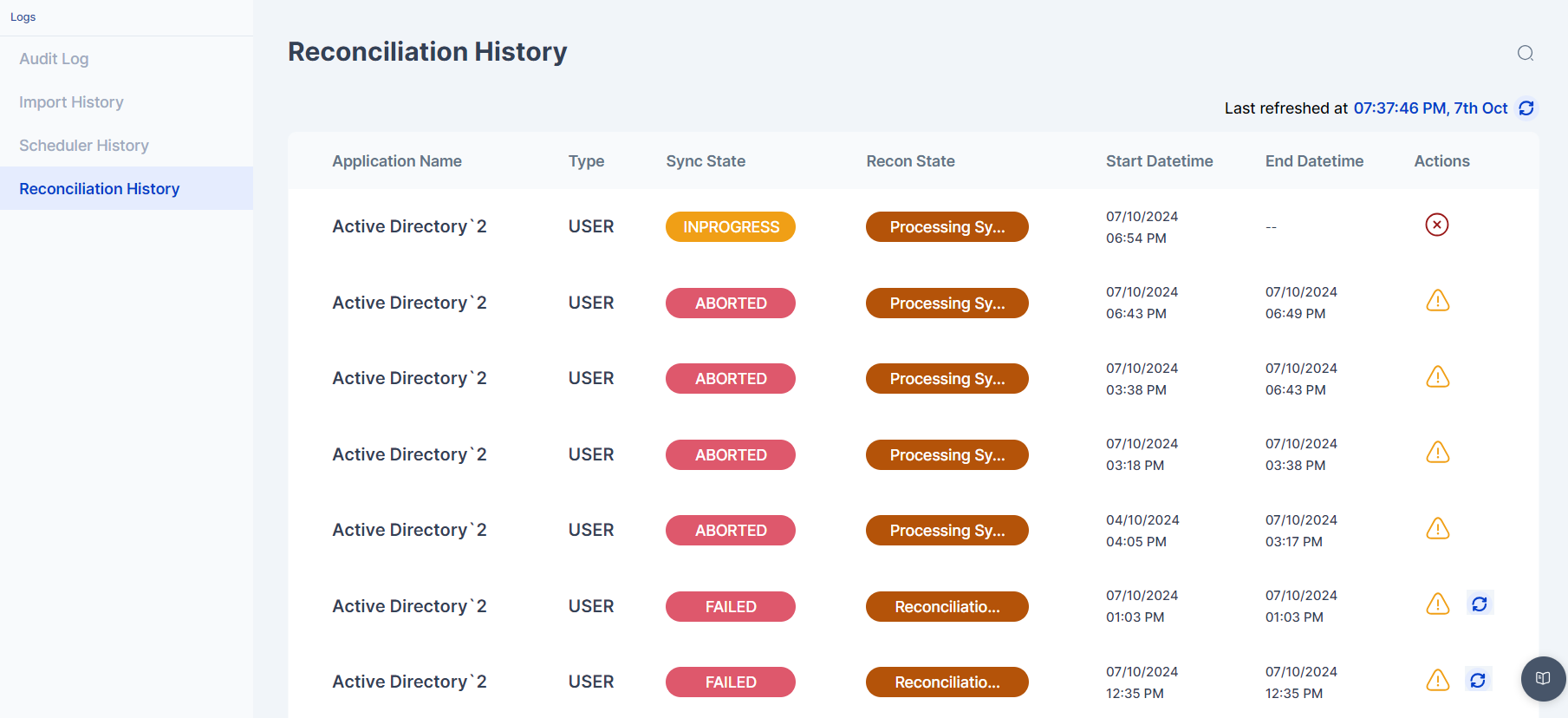 Reconciliation History provides a centralized dashboard for all system reconciliation jobs in one page. The relevant admin user can view the summary of all the tasks in progress, completed or aborted.&#x20;