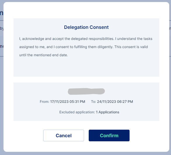 The user needs to click on the Accept button to accept the delegation. On clicking the Accept button an Assignee(delegatee) Consent is shown which the users need to read and confirm. The Consent also shows details of the delegator and the duration of the delegation.