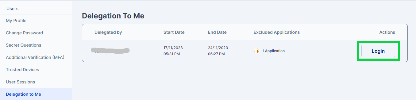 Once the user accepts the delegation the user sees a login button, to login into cymmetri as the delegator