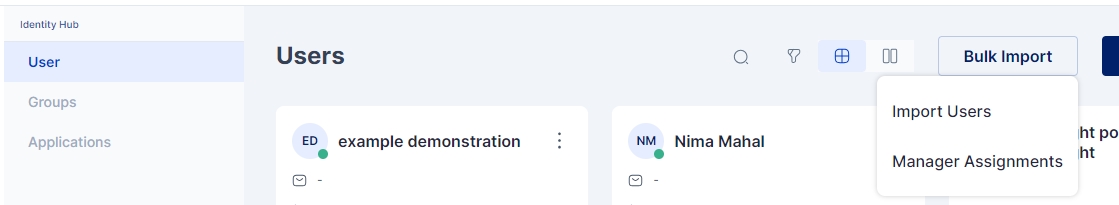 For Importing Users in the Cymmetri platform administrator needs to click on Identity Hub > User menu and then click on the Bulk Import > Import Users button.