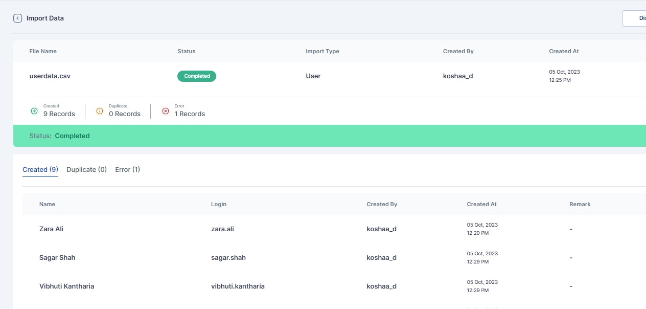 Once Imported results of successfully Imported Users, Duplicate Users, or any error that occurred during import can be seen in Logs > Import History page