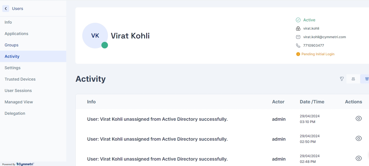 This page shows the user-specific audit log for all the various actions and activities performed by the user. This may include all activities related to the user, as shown below
