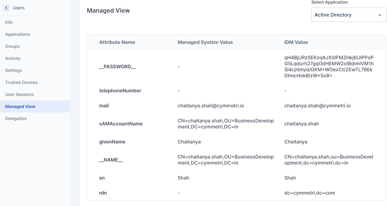 The Managed View page shows the user data based on various provisioning applications assigned to a user. This page shows the Attribute Name, Managed System Value, and IDM Value