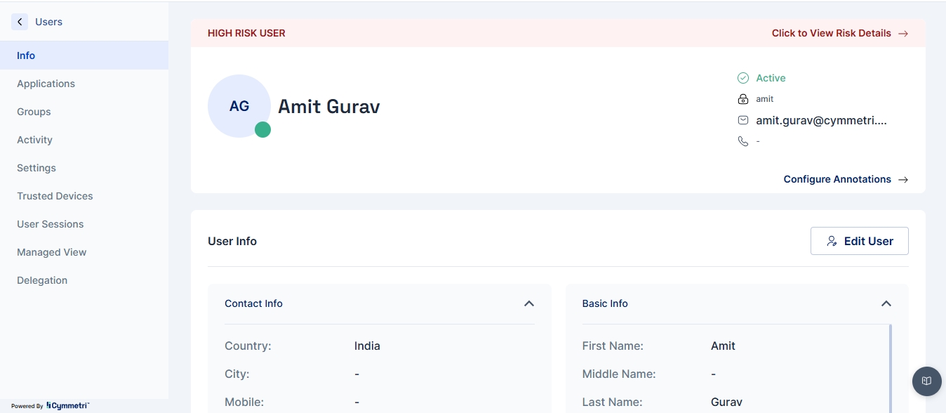 The user's risk details are visible on the page to notify that the user is a high-risk user. On further clicking on that page, it shows the User's Risk metrics.