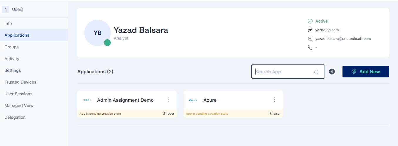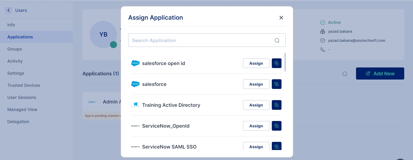 Assigning New Applications: Should you need to add more applications to your list, the process is simple. Just click on the Add New Button located on the interface. This action opens up a selection window where you can choose additional applications that you wish to assign to the user.