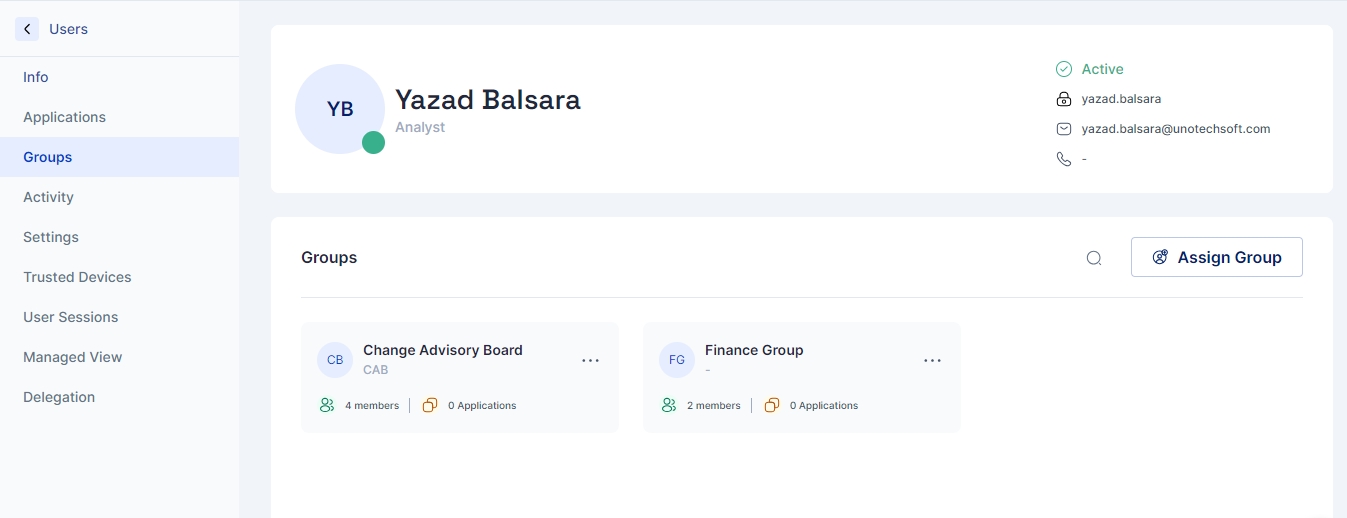 This page provides an overview of the groups to which a user is assigned, reflecting the current status of each.