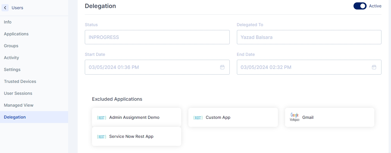 The page shows the status of the Delegation (INPROGRESS, COMPLETED), Designated To, Start Date, End Date, and the list of Excluded Applications(if any)