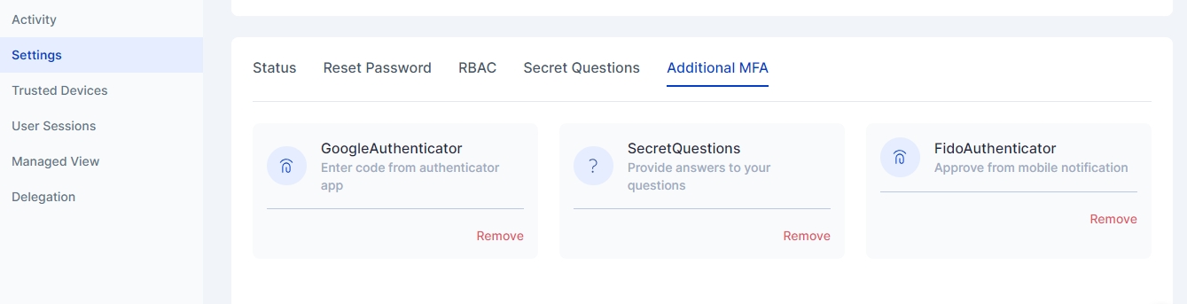 Administrators can view the MFA mechanisms configured by the user, as well as remove the configured MFA if required for a specific user
